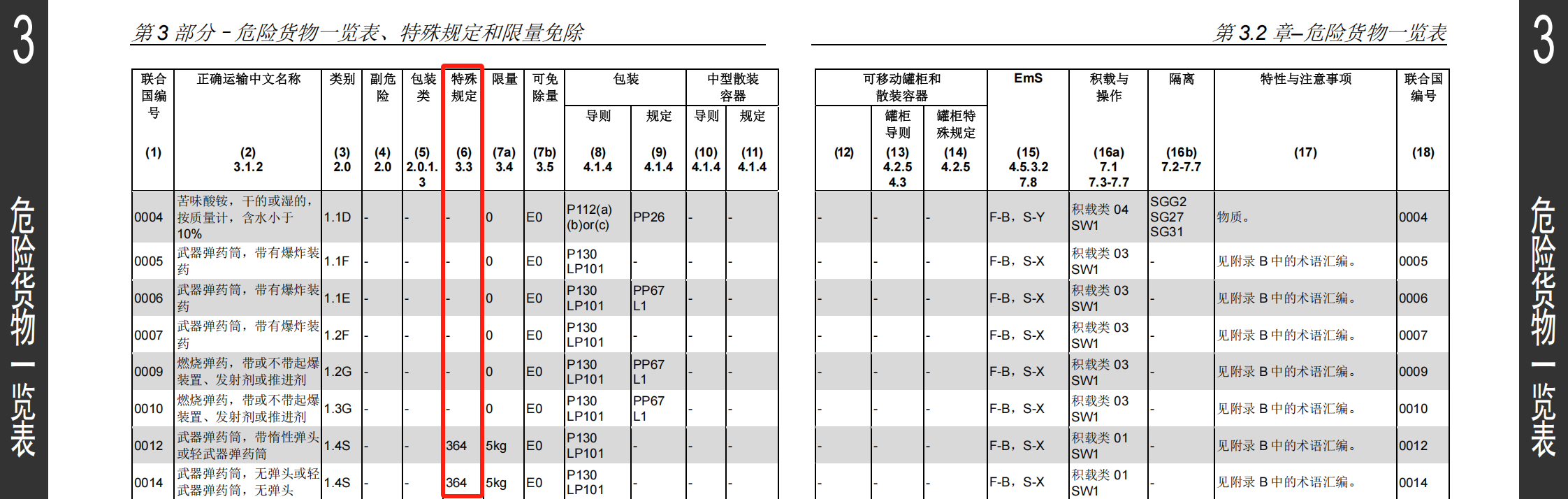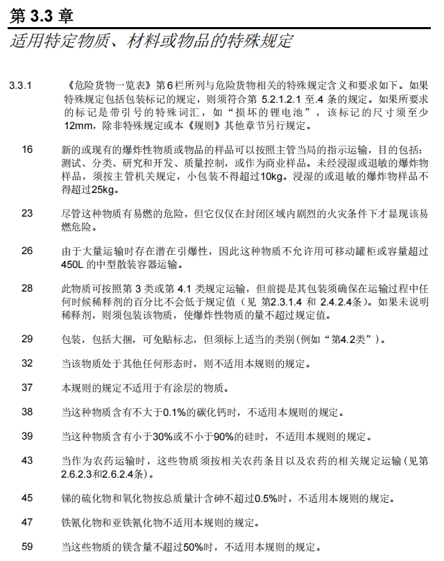 (6)特殊规定:所列的数字对应《危规》第3.3章中的规定。特殊规定通常优于一般规定,所以,很多危险货物可以按普通货物运输,其中的豁免大多就是源于此。