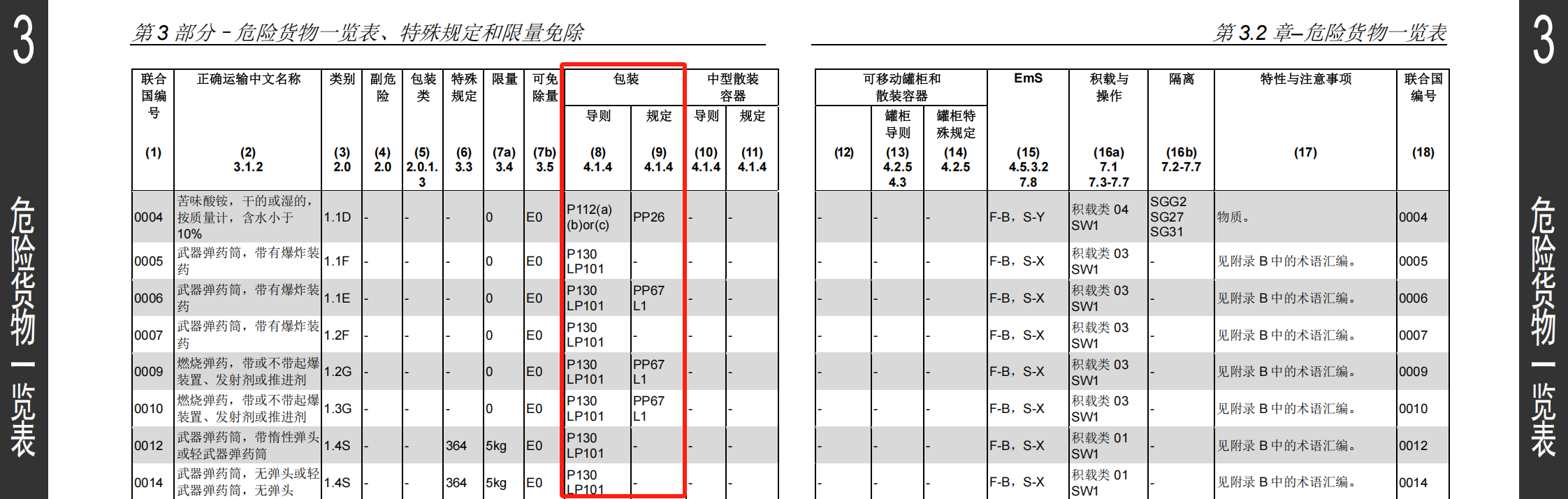 (8)包装导则:字母数字代码对应《危规》4.1.4节包装导则一览表的包装要求。包装导则指明了可用于运输物质和物品的包装容器(包括大宗包装)。字母P开头的主要是常规包装(容积不超过450L/净重不超过400kg)、压力容器等,LP开头的是大宗包装。