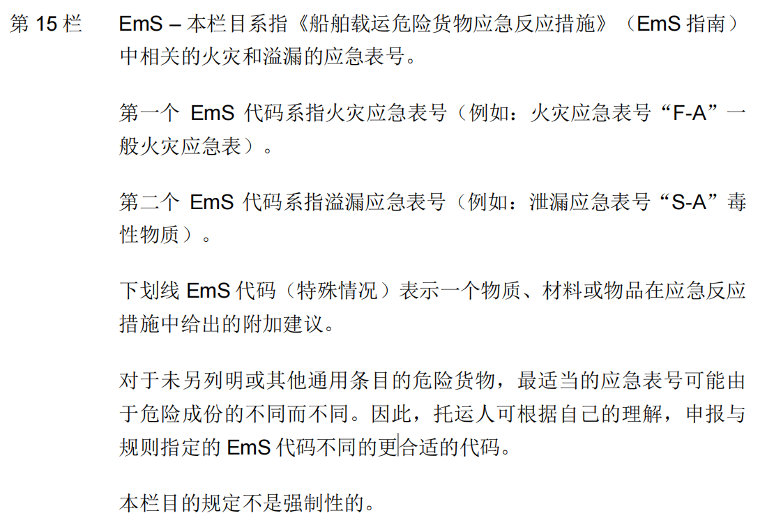 (15)EmS是指《船舶载运危险货物应急反应措施》(EmS 指南)中相关的火灾和溢漏的应急编号。