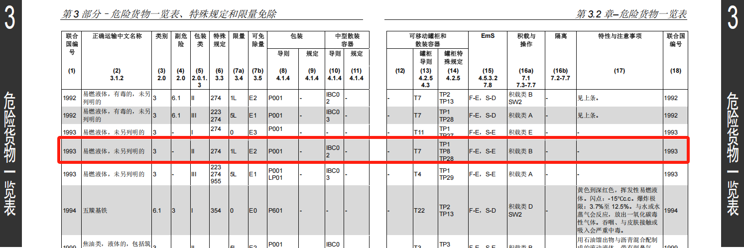 1、查危险货物一览表,锁定UN1993,包装类别II对应的那一栏;