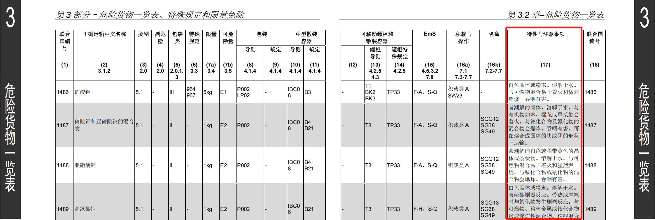 (17)特性与注意事项:包含危险货物的特性和注意事项。本栏的规定不是强制性的。